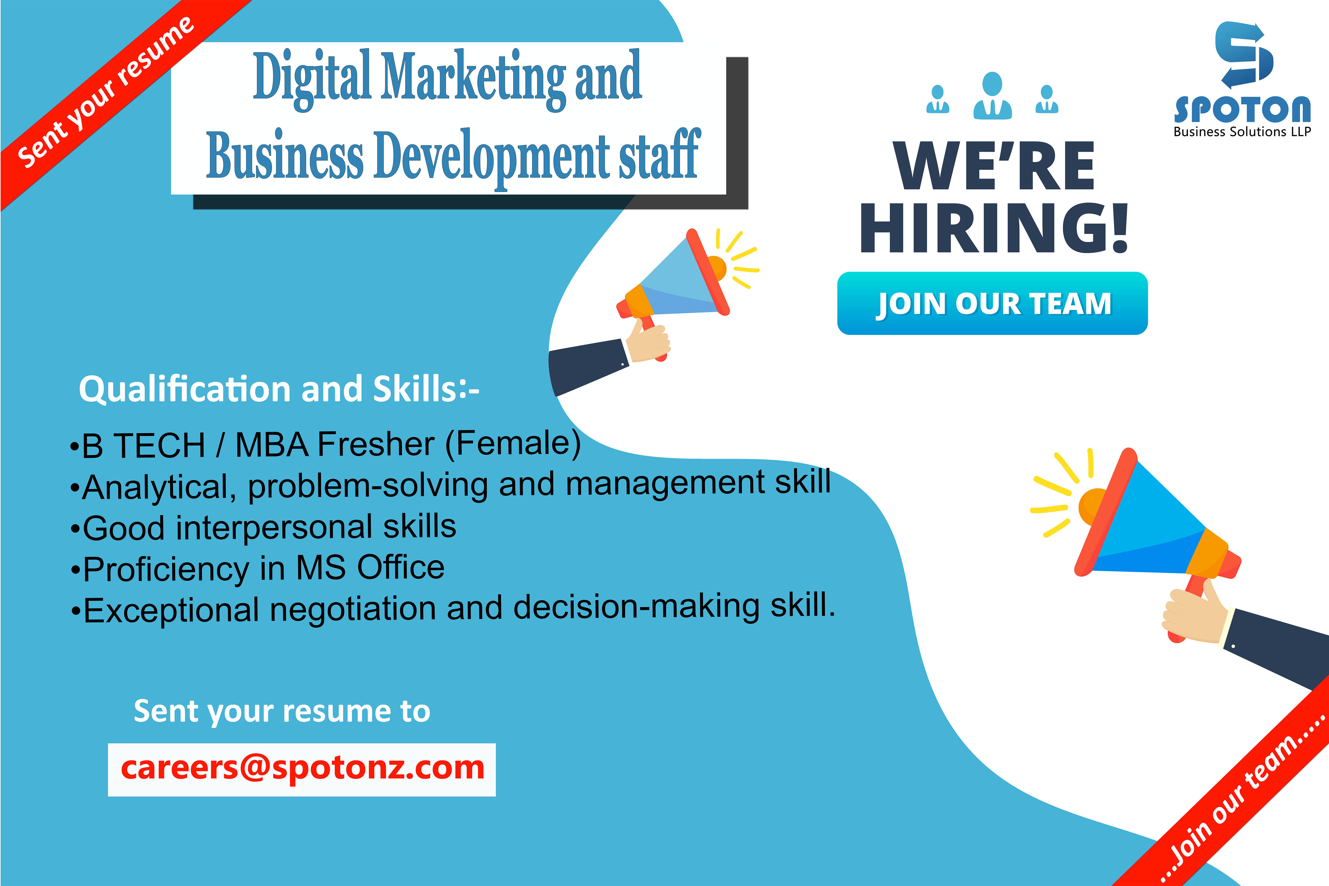 Digital Marketing and Business Devolopment staff Mail your cv to careers@spotonz.com 24-05-2021 Status : ACTIVE